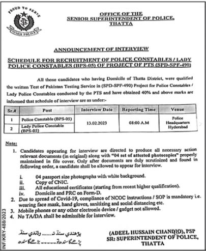 Police Department invites applications for job positions advertised in daily Jang dated 10 February 2023 for following vacancies in Thatta, hyderabad and thatta Sindh Pakistan.