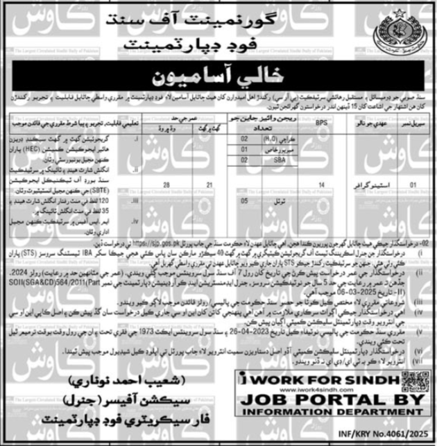 Vacant posts including stenographer are announced in Food Department Karachi, karachi Sindh Pakistan as per 5 December 2025 advertisement in daily Kawish Newspaper. Bachelor and Intermediate etc. educational qualification will be preferred.