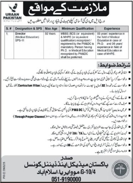 Pakistan Medical and Dental Council G-10/4 Islamabad, islamabad Islamabad Pakistan invites applications from eligible candidates for the post of director as per advertisement of November 12, 2025 published in daily K2 Newspaper. MBBS and BDS etc. educational qualification will be preferred.