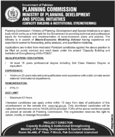 Vacant posts including macroeconomic modelling advisor are announced in Planning Commission Islamabad, islamabad Islamabad Pakistan as per 18 April 2025 advertisement in daily K2 Newspaper. Candidates with Bachelor, MS and Master etc. educational background will be preferred.