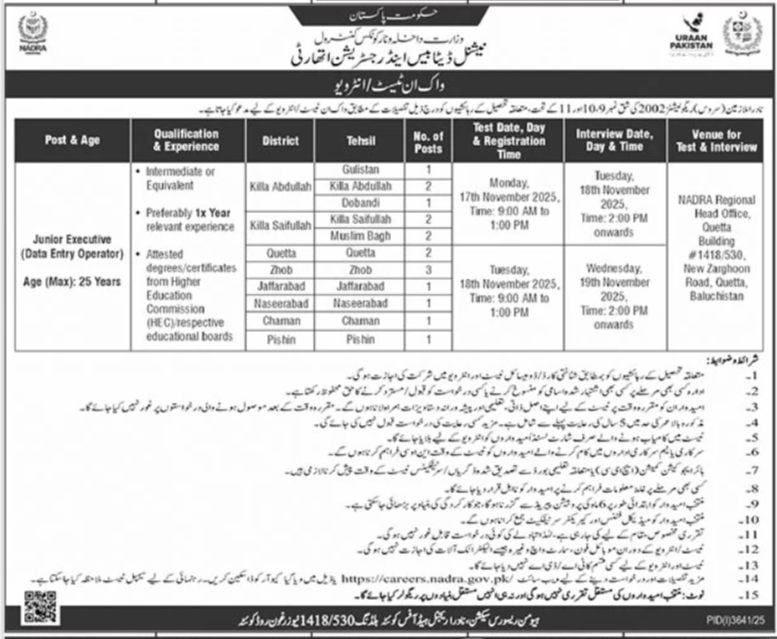 National Database & Registration Authority NADRA invites applications for job positions advertised in daily Jang dated 2 November 2025 for following vacancies in Quetta, quetta Balochistan Pakistan.