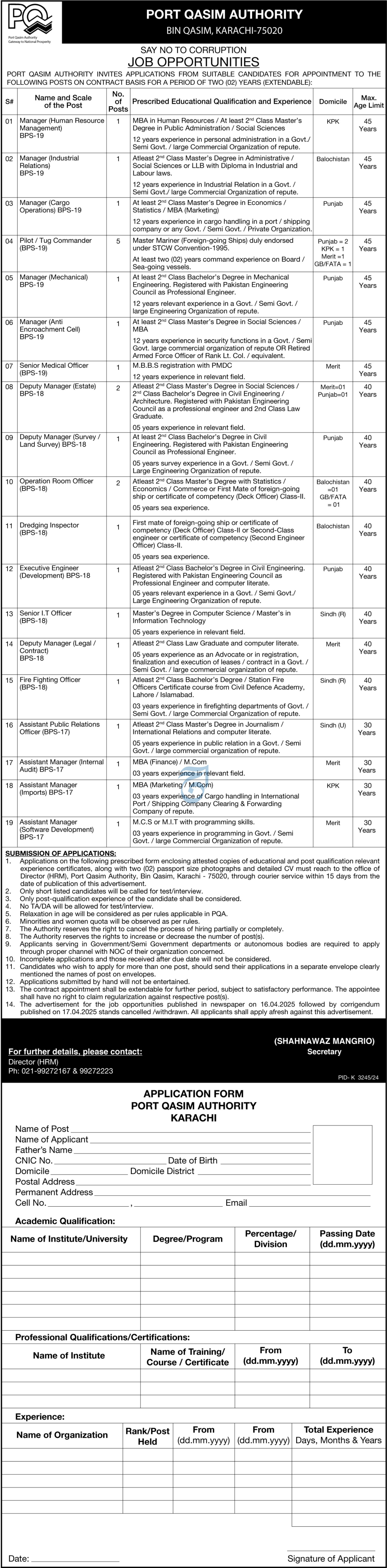 Port Qasim Authority PQA jobs advertisement dated about 25 April 2025 in daily Aaj Newspaper invites application for the vacant post of It Officer, Assistant Manager Internal Audit, Operation Room Officer, Manager Anti Enforcement Cell, Executive Engineer, Deputy Manager Legal, Manager Cargo Operations, Deputy Manager, Fire Fighting Officer, Medical Officer, Assistant Public Relations Officer, Assistant Manager Imports, Assistant Manager Software Development, Pilot, Deputy Manager Land Survey, Manager, Assistant Manager, Executive Engineer Development, Deputy Manager Estate, Deputy Manager Survey, Manager Mechanical, Deputy Manager Contract, Manager Industrial Relations, Tug Commander, Dredging Inspector and Manager Human Resource Management in Karachi, karachi Sindh Pakistan. Bachelor, Master, Intermediate and MS etc. educational qualification will be preferred.