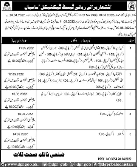 Health Department jobs advertisement dated about 21 April 2022 in daily Jang Newspaper invites application for the vacant post of dental technician, sanitary inspector, hemodialysis technician, female medical technician, lady health visitor, malaria supervisor, medical technician, anesthesia technician, ecg technician, vaccinator, dispenser, dresser, xray assistant, projectionist, computer operator, tehsil sanitary inspector, electrician, store keeper, operation theater assistant, laboratory assistant, midwife and eye technician in Kalat, kalat Balochistan Pakistan. Intermediate, Bachelor, Others and Matric etc. educational qualification will be preferred.