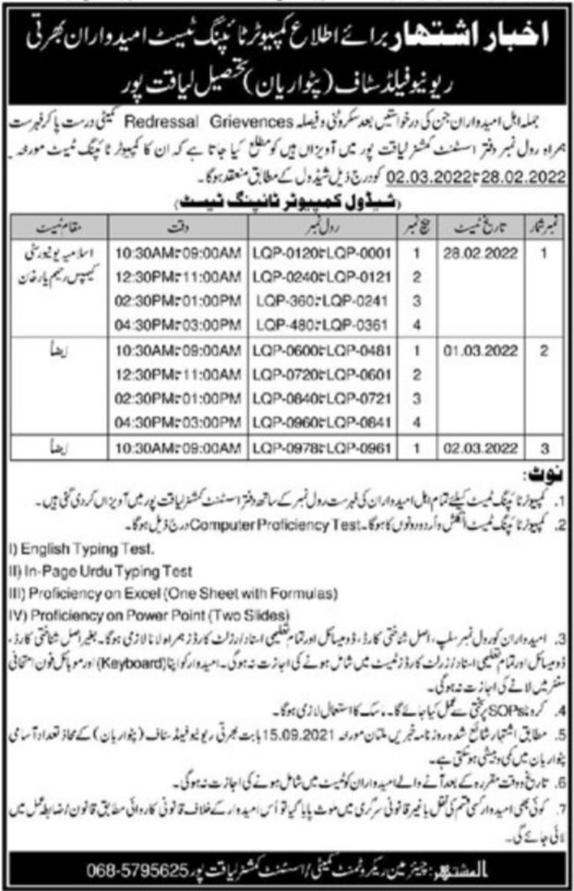Revenue Department Rahim Yar Khan, rahim yar khan Punjab Pakistan invites applications from eligible candidates for the post of patwari as per advertisement of February 24, 2022 published in daily Khabrain Newspaper. Preferred Education is Intermediate etc.