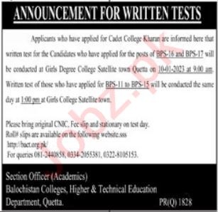 Notice for Writtern Test for jobs at Cadet College Kharan