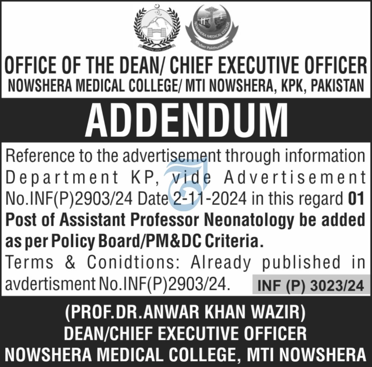Vacancies in Nowshera Medical College Nowshera Advertisement November 2024