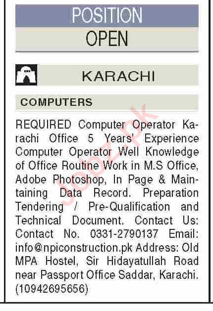 Vacant posts including computer operator are announced in NPI Construction & Engineering Karachi, karachi Sindh Pakistan as per 2 August 2022 advertisement in daily Dawn Newspaper. Persons with Intermediate and Bachelor etc. education can apply.