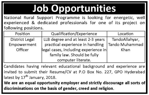NRSP Sindh Jobs 2018 for District Legal Empowerment Officer