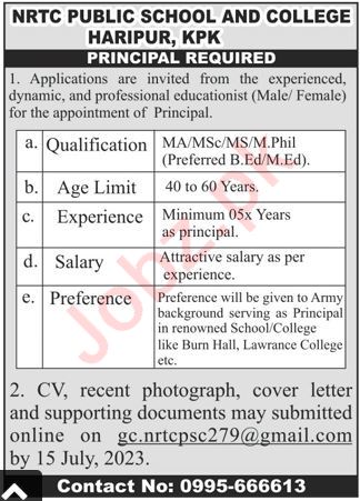 NRTC Public Schools and Colleges System invites applications for job positions advertised in daily Aaj dated 2 July 2023 for following vacancies in Haripur, haripur Khyber Pakhtunkhwa KPK Pakistan.