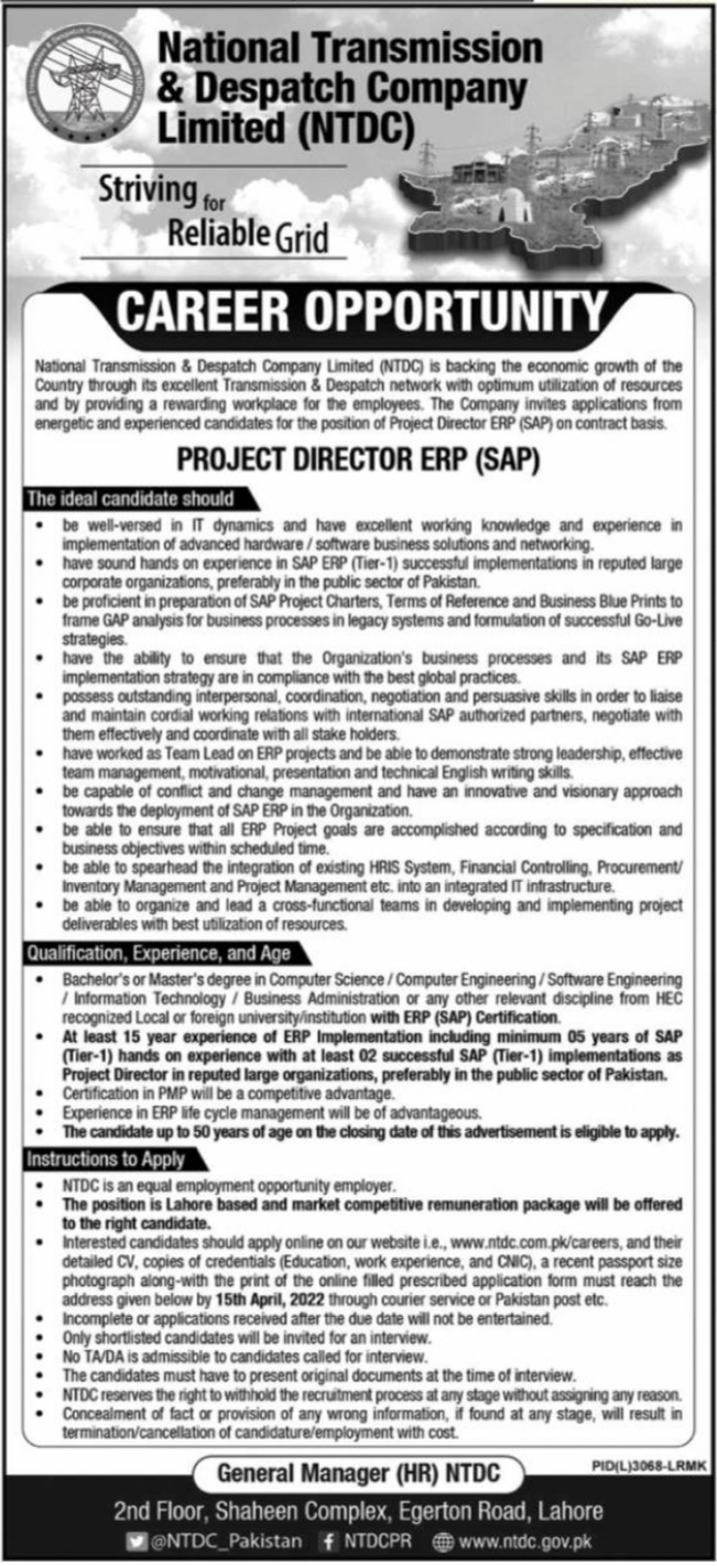 National Transmission and Despatch Company NTDC jobs advertisement dated about 31 March 2022 in daily Nawaiwaqt Newspaper invites application for the vacant post of project director, project director sap and project director erp in Lahore, lahore Punjab Pakistan. Candidates with Master and Bachelor etc. educational background will be preferred.