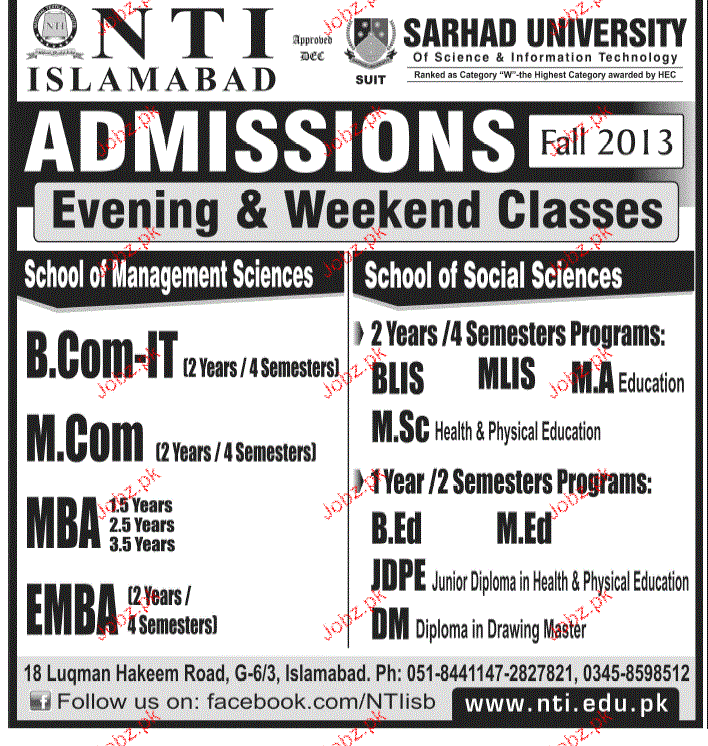 NTI Islamabad Admission in BCom, MCom, MBA, MA and DM in Islamabad Read newspaper ad for exact details.