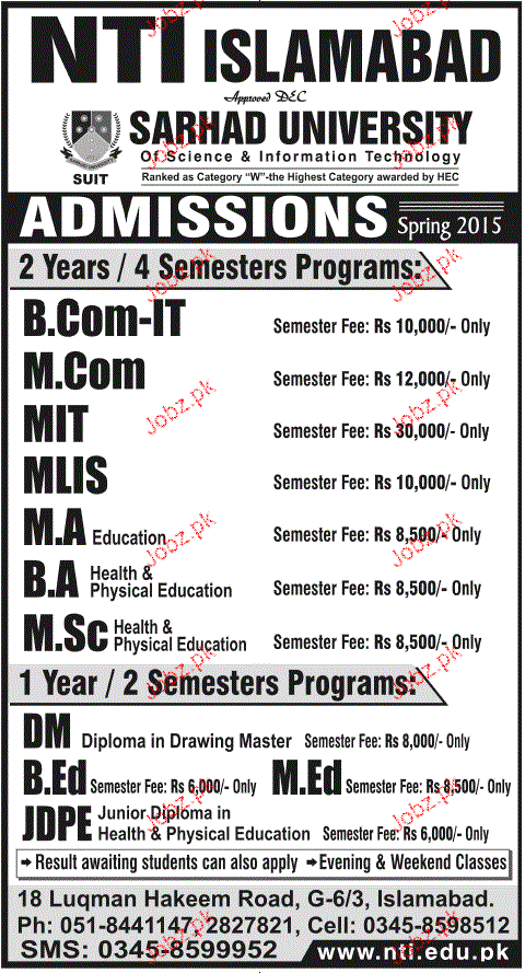 NTI Islamabad Admission in FA, BS, MA, BA, MCs, MBF and B.Ed in Islamabad. Read newspaper ad for exact details.