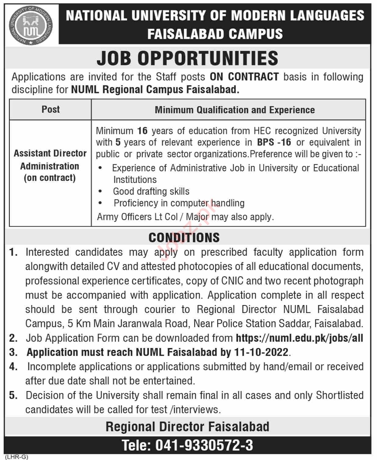 National University of Modern Languages NUML is looking for candidates for following posts as per job advertisement published in daily Dawn Newspaper of September 26, 2022 for location Faisalabad, faisalabad Punjab Pakistan: