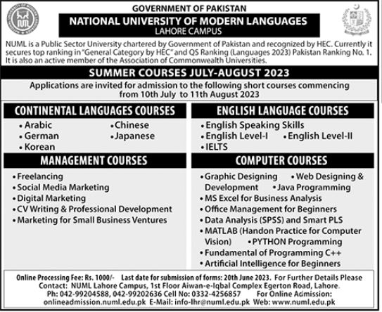 National University of Modern Languages NUML admissions 2023 for Continental Language Courses of Arabic, Chinese, German, Japanese, Korean, English Language, English Speaking Skills, English Level-I, English Level II, IELTS, Management Courses of Freelancing, Social Media Marketing, CV Writing & Professional Development, Marketing for Small Business Development Ventures, Computer Courses has been announced. National University of Modern Languages NUML Lahore Punjab Pakistan welcomes students to apply for admissions in academic year 2023 in Computer Course. Eligible candidates for admissions in Diploma and Course can apply as per Government institute criteria and before closing date 20 June 2023 after reading advertisement online. Read newspaper ad for exact details.