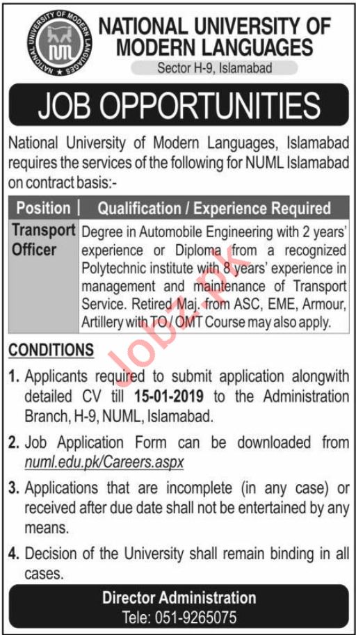 Latest National University of Modern Languages NUML Transportation Posts Islamabad 2025