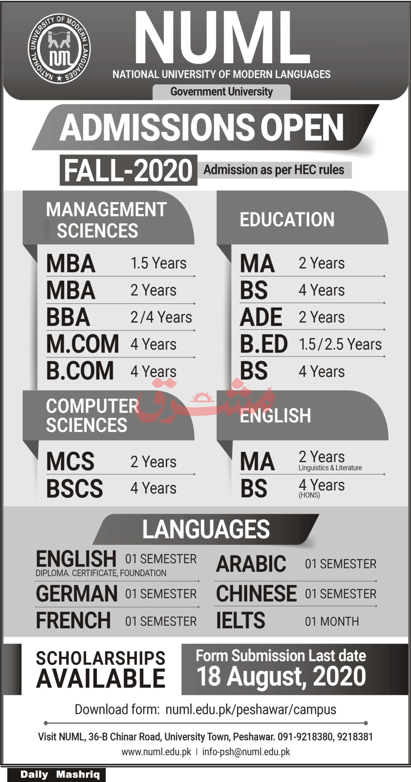 National University of Modern Languages NUML Peshawar Campus has announced admissions in MBA, BBA, M-Com, B-Com, MA, BS, ADE, B,Ed, MCS, BSCS, English Language Course, Arabic Language Course, German Language Course, Chinese Language Course, French Language Course and IELTS. Read newspaper ad for exact details.