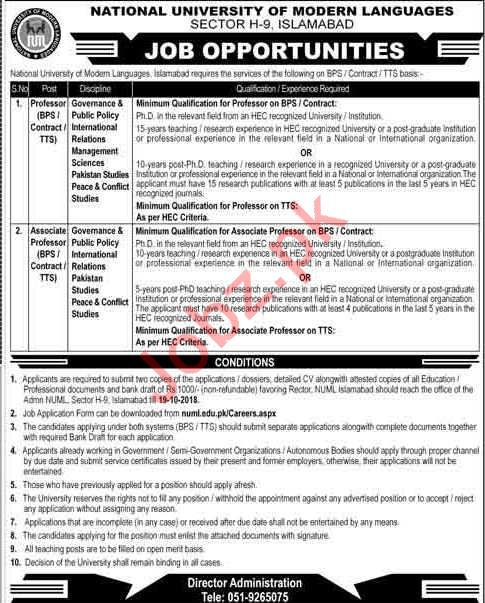 Vacancies in National University of Modern Languages NUML Advertisement September 2018