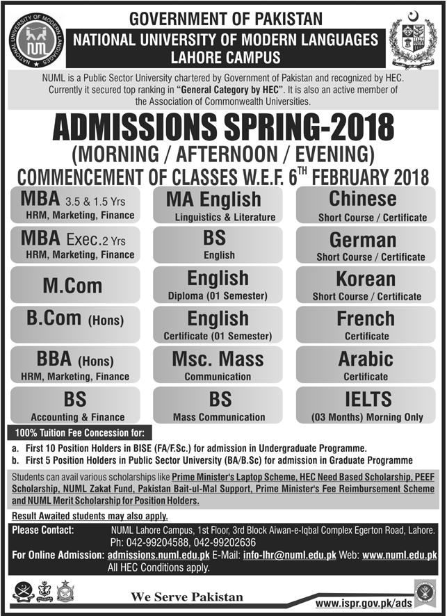 National University of Modern Languages NUML Lahore Campus, Government of Pakistan start admissions spring 2018 for the classes of B Com,BBA, BS M Com, MBA, MA English, BS English, Chinese Language, German Language and Korean Language. Read newspaper ad for exact details.