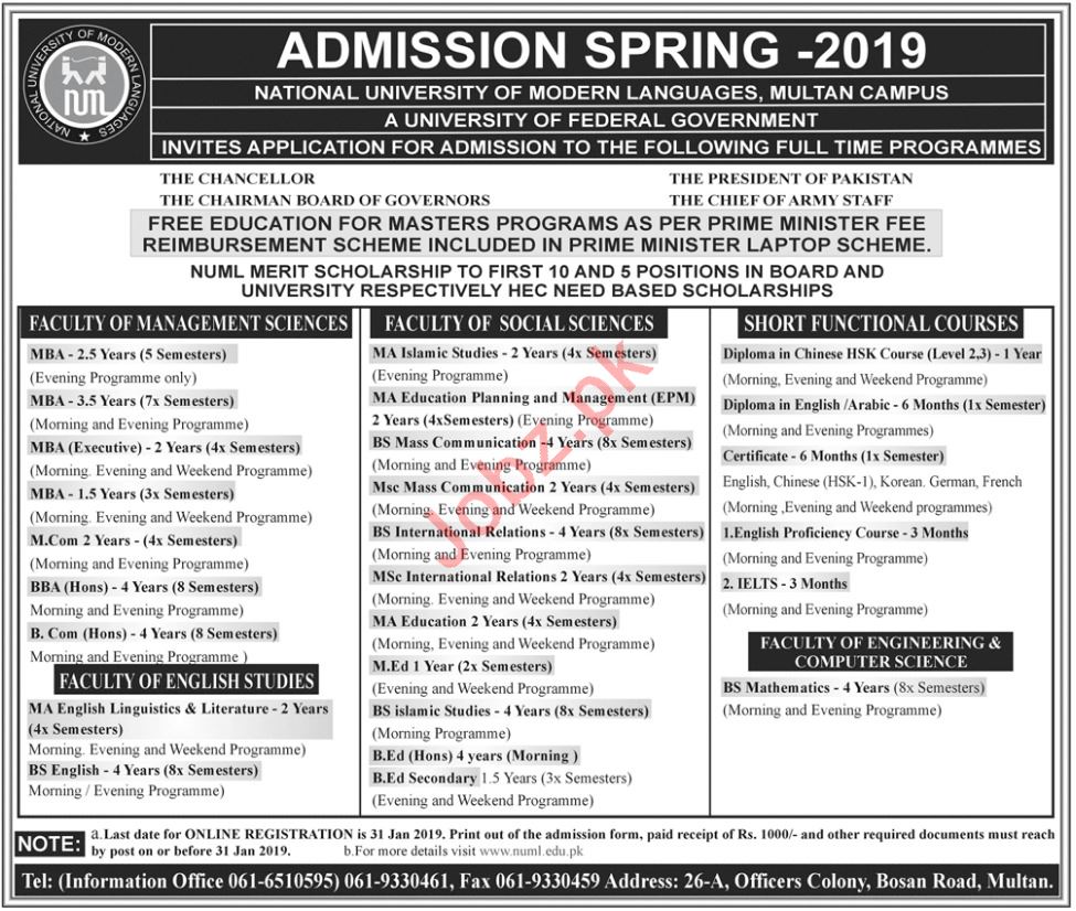 National University of Modern Languages NUML Multan Campus, Pakistan are stared admissions spring 2019 for the classes of MBA, M Com, BBA Hons, B Com, BS, MA, M Sc, BEd, MEd, Diploma. Read newspaper ad for exact details.