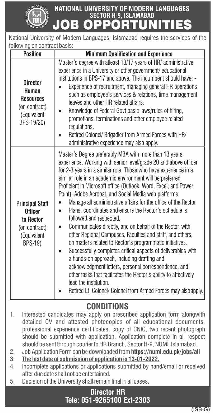 Vacancies in National University of Modern Languages NUML Advertisement December 2021