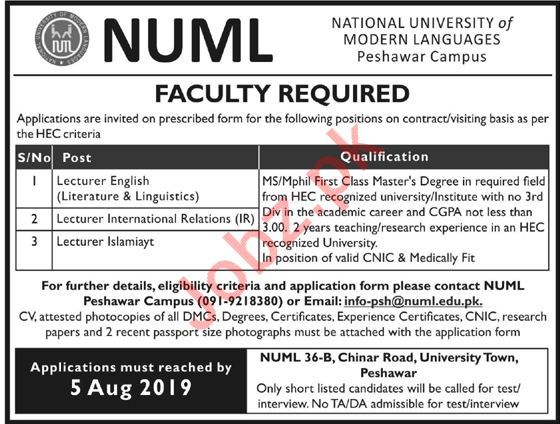 Vacancies in National University of Modern Languages NUML Advertisement July 2019