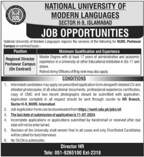 National University of Modern Languages NUML invites applications for job positions advertised in daily Mashriq dated 27 June 2024 for following vacancies in Peshawar, peshawar Khyber Pakhtunkhwa KPK Pakistan.