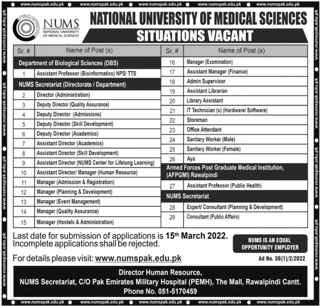 National University of Medical Sciences NUMS jobs advertisement dated about 27 February 2022 in daily Jang Newspaper invites application for the vacant post of assistant director academics, it technician, manager event management, deputy director academics, deputy director admission, assistant librarian, director administration, manager quality assurance, hardware technician, manager examination, library assistant, consultant public affairs, manager admissions, manager hostels administration, store man, deputy director quality assurance, assistant director skill development, manager planning development, sanitary worker, assistant professor bioinformatics, office attendant, software technician, assistant director manager hr, deputy director skill development, aya, manager registration, expert consultant planning development, assistant professor public health, admin supervisor and assistant manager finance in Rawalpindi, rawalpindi Punjab Pakistan. Candidates with Primary, Mphil, Matric, Middle, Phd, Intermediate, Bachelor and Master etc. educational background will be preferred.