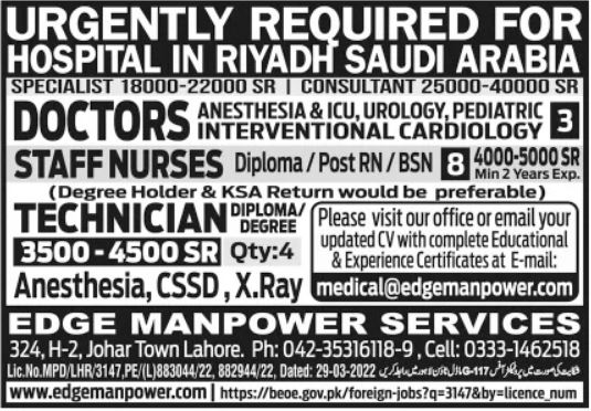 Edge Manpower Services is looking for candidates for following posts as per job advertisement published in daily Jang Newspaper of April 3, 2022 for location Saudi Arabia, saudi arabia Saudi Arabia: