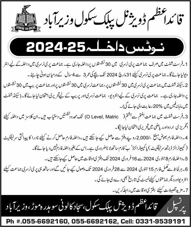 Quaid e Azam Divisional Public School Nursery Class admissions 2024 has been announced. Eligible students who qualify as per admission criteria in Quaid e Azam Divisional Public School Wazirabad Punjab Pakistan can apply in Management School for academic year 2024. Students for admissions in Primary can apply for online or campus classes as per Government institute criteria till admission closing date February 28, 2024. Read newspaper ad for exact details.