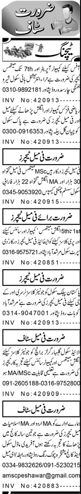 Private School invites applications for job positions advertised in daily Aaj dated 20 May 2023 for following vacancies in Peshawar, peshawar Khyber Pakhtunkhwa KPK Pakistan.