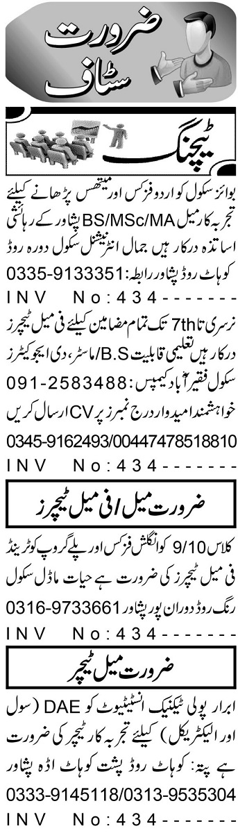 Private School invites applications for job positions advertised in daily Aaj dated 4 October 2024 for following vacancies in Peshawar, peshawar Khyber Pakhtunkhwa KPK Pakistan.