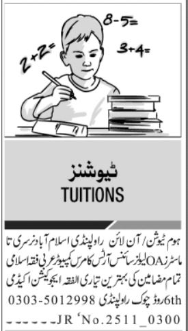 Academy jobs advertisement dated about 13 November 2025 in daily Jang Newspaper invites application for the vacant post of nursery teacher, arabic teacher, a level teacher, o level teacher, science teacher, commerce teacher, arts teacher, teacher and computer teacher in Satellite Town - 6th Road Rawalpindi, rawalpindi Punjab Pakistan. Preferred Education is Bachelor and Master etc.