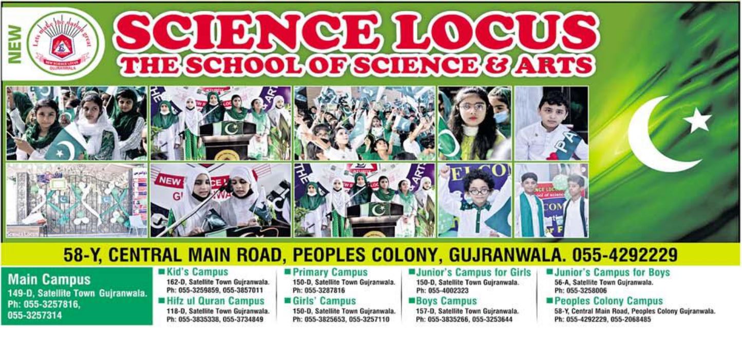 Science Locus The School of Science & Arts admissions 2022 for Nursery to Matric has been announced. Students can enroll for admissions in Science Locus School Gujranwala Punjab Pakistan for academic year 2022 to continue campus based or online education in Science School. Students who want to enroll for academic session 2022 in Matric, Middle and Primary qualification and admission criteria for Private institute can apply till last date 14 September 2022. Read newspaper ad for exact details.