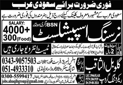MSMS Global Al Saqib Recruitment Group Overseas Employment Promoters jobs advertisement dated about 1 September 2024 in daily Express Newspaper invites application for the vacant post of nursing specialist in Makkah, makkah Saudi Arabia. etc. educational qualification will be preferred.