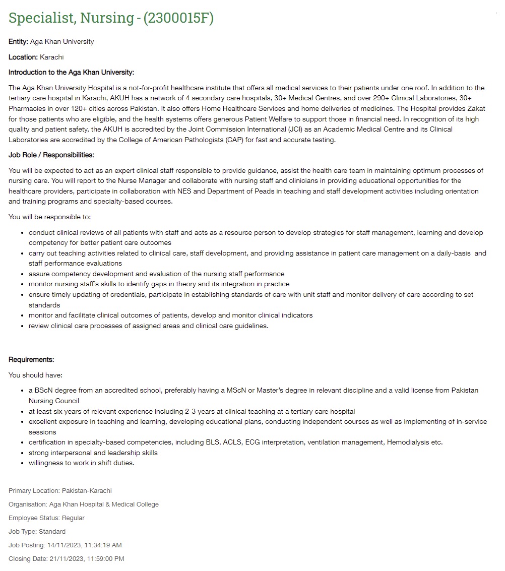 Aga Khan University invites applications for job positions advertised in daily Other dated 15 November 2023 for following vacancies in Karachi, karachi Sindh Pakistan.