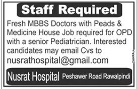Nusrat Hospital invites applications for job positions advertised in daily The News dated 7 February 2022 for following vacancies in Rawalpindi Punjab Pakistan.