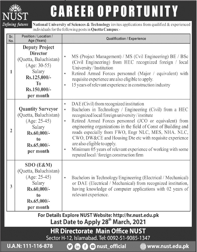 Vacancies in National University of Science & Technology NUST Advertisement March 2021