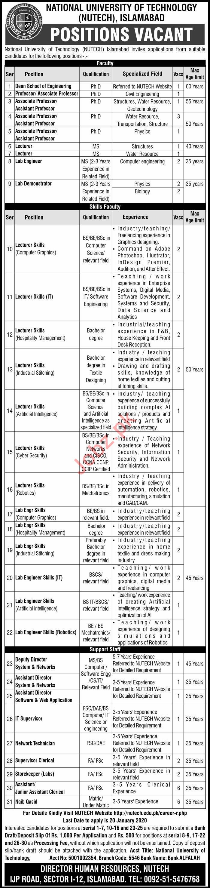 National University of Technology NUTECH Islamabad, Government of Pakistan seeks candidates for the posts of Dean, Professor, Associate Professor, Assistant Professor, Lecturer, Lab Engineer, Lab Demonstrator, Deputy Director, Deputy Director System, Deputy Director Network, Assistant Director, Assistant Director System, Assistant Director Network, Assistant Director Software, Assistant Director Web Application, IT Supervisor, Network Technician, Supervisor Clerical, Storekeeper, Assistant, Assistant Clerical, Naib Qasid.