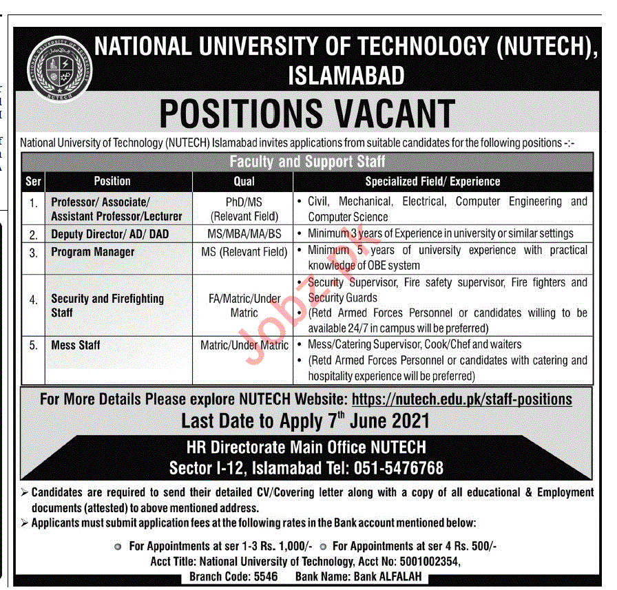 Vacancies in National University of Technology NUTECH Advertisement May 2021