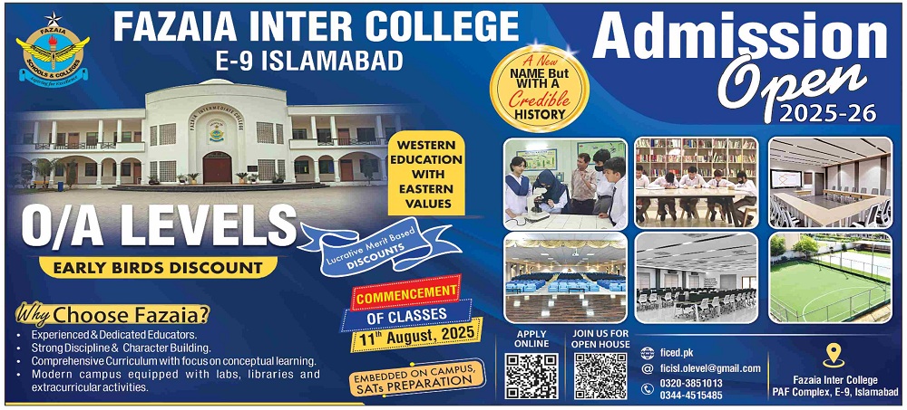 Fazaia Inter College Jinnah Camp admissions 2025 for a levels has been announced. Students can enroll for admissions in Fazaia Inter College Jinnah Camp Islamabad Islamabad Pakistan for academic year 2025 to continue campus based or online education in Science University. Eligible students for fulfilling criteria for admissions in can enroll as per Government admission policy 2025 till closing date. Read newspaper ad for exact details.