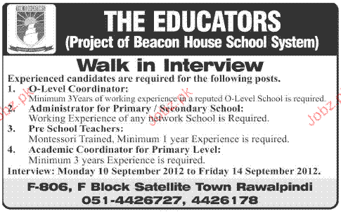 O-Level Coordinator, Pre School Teachers Job Opportunity