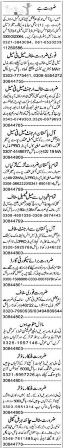 Private jobs advertisement dated about 28 February 2023 in daily Express Newspaper invites application for the vacant post of computer operator, manager, helper, call operator, office boy, assistant manager, accountant, pro, office staff, district incharge, supervisor, management staff, security guard, driver, social media marketing manager, actor, receptionist, customer dealer, clerk, male female staff, model, security supervisor, cook and office administrator in Multan, multan Punjab Pakistan. Educational qualifications required Master, Intermediate, Bachelor, Matric and Middle etc.