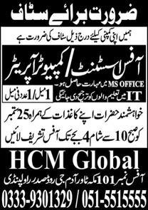 Vacant posts including computer operator and office assistant are announced in HCM Global Overseas Manpower Recruiting Company Rawalpindi, rawalpindi Punjab Pakistan as per 23 September 2023 advertisement in daily Express Newspaper. DAE, Bachelor, BA and Intermediate etc. educational qualification will be preferred.