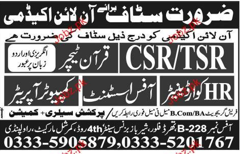 Office Assistant, Computer Operators, Quran Teachers and Call Center Representatives are required in Rawalpindi