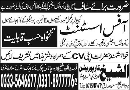 Al Sheikh Corporation jobs advertisement dated about 26 October 2025 in daily Express Newspaper invites application for the vacant post of office assistant in Chandni Chowk Rawalpindi, rawalpindi Punjab Pakistan. Persons with Middle and Matric etc. education can apply.