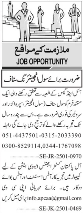 Private Company jobs advertisement dated about 28 January 2025 in daily Jang Newspaper invites application for the vacant post of surveyor, office assistant, office boy, supervisor and civil engineer in Karachi, karachi Sindh Pakistan. Candidates with BA, DAE, Middle, Intermediate, Matric and Bachelor etc. educational background will be preferred.