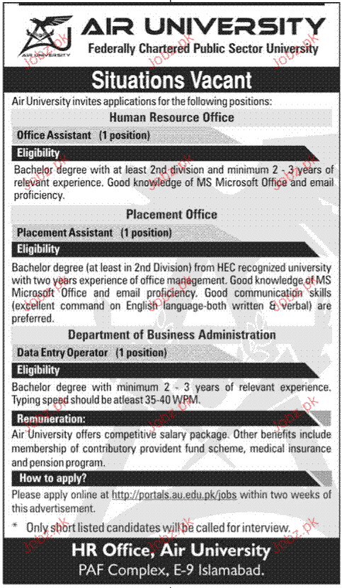 Latest Air University Admin Clerical Posts Islamabad 2025
