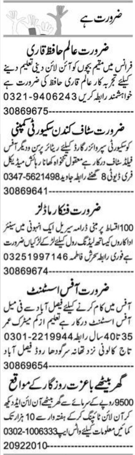 Private Company Faisalabad, faisalabad Punjab Pakistan invites applications from eligible candidates for the post of office assistant, model, actor, typist, hafiz, teacher, office staff, quran teacher, qari, field staff and security supervisor guard as per advertisement of January 12, 2024 published in daily Express Newspaper. Educational qualifications required Bachelor, Intermediate, Matric, B.com, Middle and BA etc.