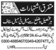 Private Company jobs advertisement dated about 29 April 2022 in daily Khabrain Newspaper invites application for the vacant post of clerk, accountant, computer call operator and office boy in Lahore, lahore Punjab Pakistan. Preferred Education is Middle, Intermediate, Bachelor and Matric etc.