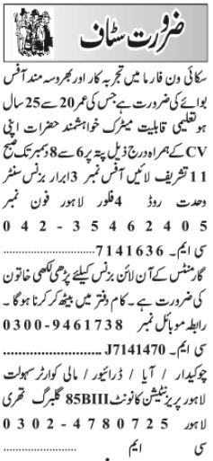 Private Company jobs advertisement dated about 3 January 2024 in daily Jang Newspaper invites application for the vacant post of driver, mali, chowkidar, watchman, gardener, online sales expert, office boy and aya in Lahore, lahore Punjab Pakistan. Educational qualifications required Middle, Bachelor, Intermediate and Matric etc.